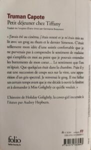 Heureusement, Audrey Hepburn est venue ensoleiller ces pages – bien que Truman Capote eut préféré Marylin Monroe pour incarner son célèbre personnage -. Outre sa lumineuse présence en couverture, difficile d’oublier sa vivacité et sa façon d’être ; il me semblait entendre sa voix. percevoir ses sautillements, et la sentir virevolter tout au long du récit. Il était facile de se représenter Holly, lunettes noires vissées au visage, et petite robe passée dans la culture populaire.